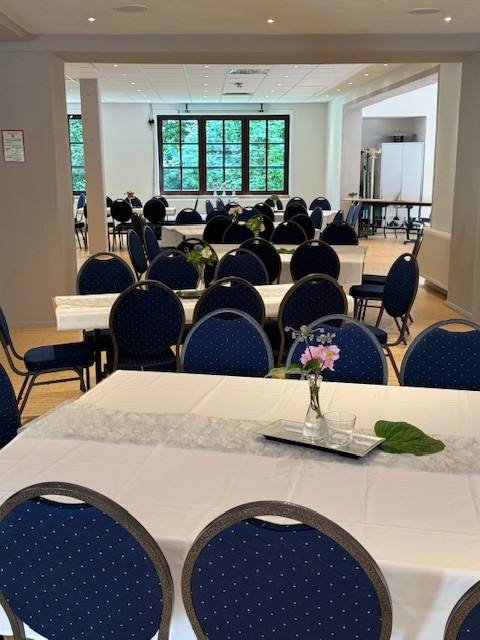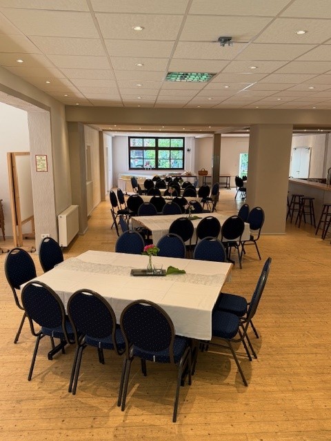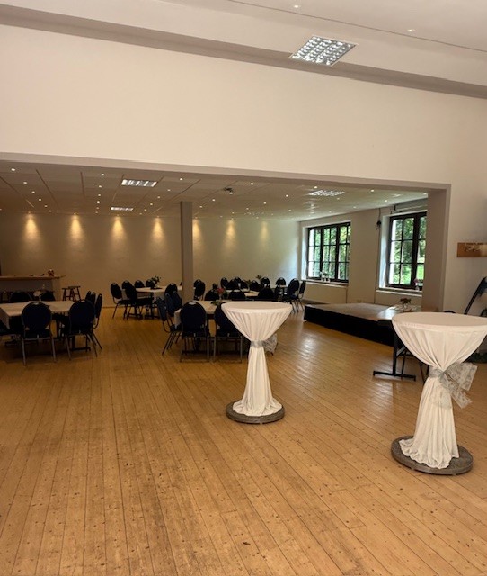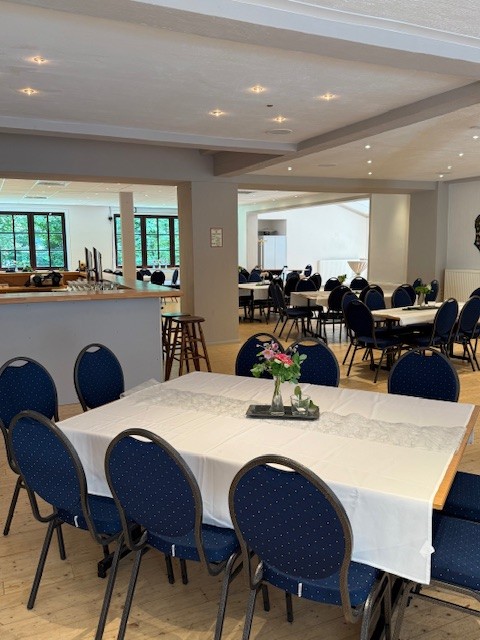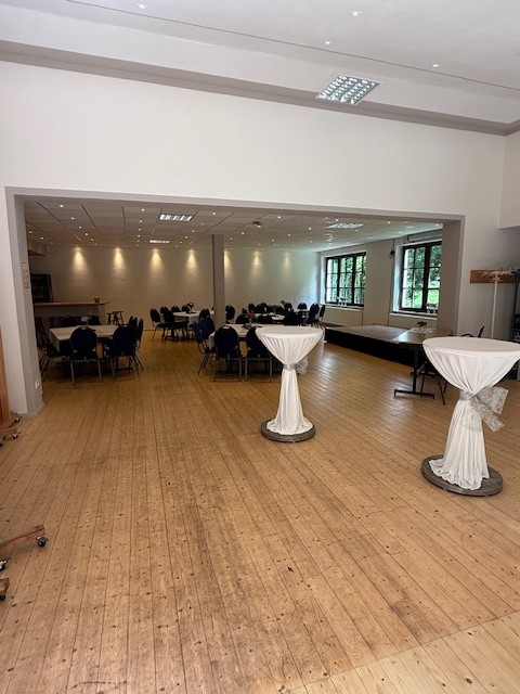 Der Innenbereich bietet genug Raum für große Feiern, Tagungen oder Vereinsveranstaltungen. Dank variabler Bestuhlung kann der Saal flexibel auf jede Art von Event angepasst werden.